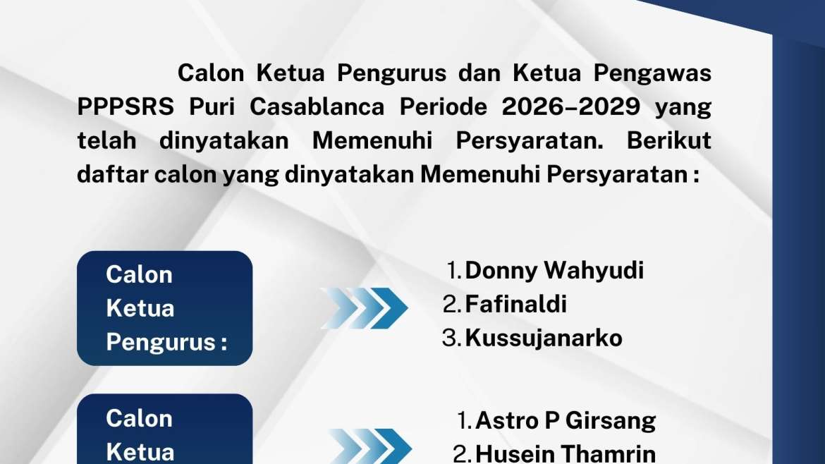 3 days ago 0Comments Calon Ketua Pengurus & Ketua Pengawas PPPSRS Puri Casablanca 2026-2029 Cek Selengkapnya